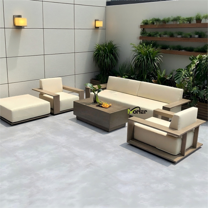 5. โซฟาไม้สักกลางแจ้ง: ผลิตจากไม้สักธรรมชาติที่ทนทานต่อสภาพอากาศ โซฟาตัวนี้มีลายละเอียด มีความมั่นคงสูง และพัฒนาความรู้สึกหรูหรามากขึ้นเมื่อใช้งาน ทำให้เป็นตัวเลือกคลาสสิกสำหรับการสร้างระเบียงสไตล์รีสอร์ทระดับไฮเอนด์