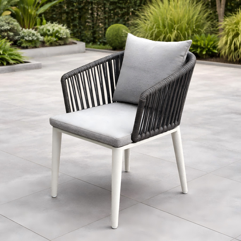 เก้าอี้ทานอาหารมีพนักพิงแบบเชือกทอ ทำให้เกิดรูปลักษณ์ที่ทันสมัยและหรูหรา ในขณะเดียวกันก็ให้การรองรับที่สะดวกสบาย โครงทำจากอะลูมิเนียมเคลือบสีฝุ่น ซึ่งทนทานต่อสนิมและสภาพอากาศกลางแจ้งได้ดีเยี่ยม